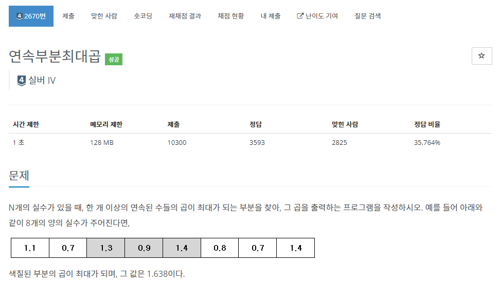// 시간복잡도 : O(N) // 권장 #include <cstdio> int N; double num[10000 + 10]; double max; void input(void) { scanf("%d", &N); for (int i = 0; i < N; i++) { scanf("%lf", &num[i]); } } void get_max(void) { double tmp = 1; for (int i = 0; i < N; i++) { if (tmp <= 1) tmp = num[i]; // tmp가 1보다 작거나 같으면 바로 지금 원소부터 다시 곱하는 것이 낫다. else tmp *= num[i]; // tmp가 1보다 크면 숫자를 곱하여 더 큰 수를 만든다. max = (tmp > max) ? tmp : max; } } int main() { input(); get_max(); printf("%.3f", max); return 0; }//시간복잡도 : O(n^2) #include <stdio.h> int n; double num[10000 + 2]; void input(void) { scanf("%d", &n); for (int i = 0; i < n; i++) { scanf("%lf", &num[i]); } } double find_max(void) { double max = 0; double tmp; for (int i = 0; i < n; i++) { tmp = 1; for (int j = i; j < n; j++) { tmp *= num[j]; if (tmp > max) max = tmp; } //printf("%.3f %.3f\n", tmp, max); } return max; } void main(void) { input(); double ans = find_max(); printf("%.3f", ans); }이 문제는 두번째 방법을 생각하기 쉽지만.... 시간복잡도가 O(n^2)이 나올 수 있다는 점을 고려해야 한다.
