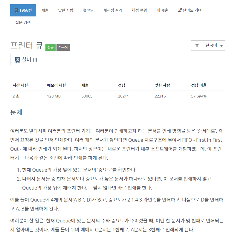 docs와 idx큐의 가장 앞에 있는 원소(각 tmp_d, tmp_i)를 꺼내어, tmp_d == D[i] 이면 현재 출력하려는 우선순위와 해당 문서의 우선순위가 동일한 것이므로 cnt 값을 증가시킨다(인쇄됨). 그런데 만약 tmp_i == M이면 우리가 찾던 그 문서이므로 cnt 값을 반환해준다. 인덱스가 같지 않다면, i 값을 증가시켜, 다음으로 출력할 우선순위를 탐색하도록 한다.
