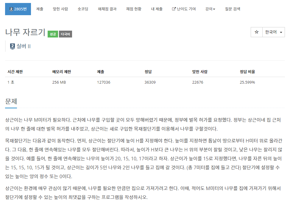 #include <cstdio> #include <iostream> #include <algorithm> int N; long long int M; int tree[1000000 + 10]; void input(void) { scanf("%d %lld", &N, &M); for (int i = 0; i < N; i++) { scanf("%d", &tree[i]); } } int get_tree(void) { std::sort(tree, tree + N); // 나무 오름차순 정렬 int s = 0; // 나무를 자르지 않고 다 가져가는 경우가 있을 수 있다. int e = tree[N - 1]; // 절단기의 최대 높이는 나무의 최대 높이 int pivot = 0; while (s <= e) { pivot = (s + e) / 2; long long int total = 0; for (int i = N - 1; i >= 0; i--) { // 나무의 높이가 절단기보다 높을 때만 연산한다. if (tree[i] > pivot) total += (tree[i] - pivot); } if (total == M) return pivot; else if (total < M) e = pivot - 1; // 절단기의 높이가 작을수록 total 늘어남 else if (total > M) s = pivot + 1; // 절단기의 높이가 클수록 total 줄어듦 } return e; } int main() { input(); int max = get_tree(); printf("%d", max); return 0; }생각할 거리가 몇가지 있다.