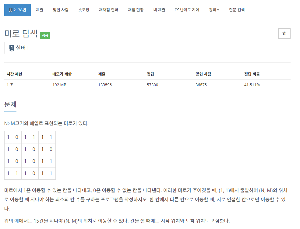 #include <cstdio> #include <iostream> #include <queue> int N, M; // 행, 열 char board[100 + 10][100 + 10]; bool visited[100 + 100][100 + 100]; struct _st { int a; int b; int t; }; std::queue<_st> Q; void input(void) { scanf("%d %d", &N, &M); for (int i = 1; i <= N; i++) { scanf("%s", &board[i][1]); // (1, 1)부터 시작 } } int maze(void) { int dir_x[4] = { 0, 0, 1, -1 }; int dir_y[4] = { 1, -1, 0, 0 }; Q.push({ 1, 1, 1 }); // (1, 1) 칸도 카운팅 visited[1][1] = true; while (!Q.empty()) { _st data = Q.front(); Q.pop(); for (int p = 0; p < 4; p++) { int na = data.a + dir_x[p]; int nb = data.b + dir_y[p]; int ntime = data.t + 1; if (na == N && nb == M) return ntime; if (na < 1 || na > N || nb < 1 || nb > M || visited[na][nb] == true || board[na][nb] == '0') continue; Q.push({ na, nb, ntime }); visited[na][nb] = true; } } } int main() { input(); int ans = maze(); printf("%d", ans); return 0; }이 문제는 전형적인 BFS 문제이다.