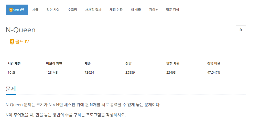 N-Queen 문제는 크기가 N × N인 체스판 위에 퀸 N개를 서로 공격할 수 없게 놓는 문제이다. N이 주어졌을 때, 퀸을 놓는 방법의 수를 구하는 프로그램을 작성하시오.