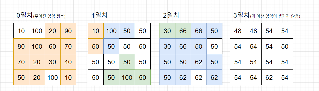 상기와 같이 하루에 영역이 동시에 생기면서 인구이동이 일어나는 경우가 있으므로 총 3일이 걸리는 것이다.