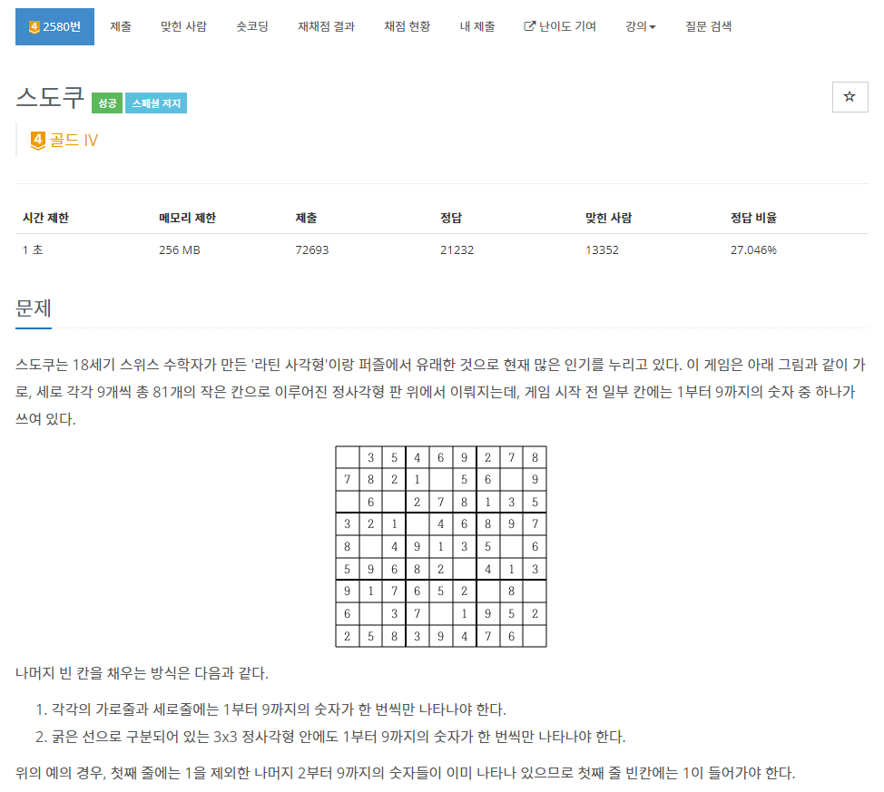 스도쿠는 18세기 스위스 수학자가 만든 '라틴 사각형'이랑 퍼즐에서 유래한 것으로 현재 많은 인기를 누리고 있다. 이 게임은 아래 그림과 같이 가로, 세로 각각 9개씩 총 81개의 작은 칸으로 이루