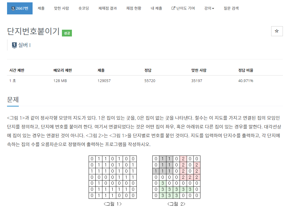 #include <cstdio> #include <algorithm> int N; char city_map[25 + 2][25 + 2]; int visited[25 + 2][25 + 2]; int danji; int cnt; int ans[25 * 25 + 2]; void input(void) { scanf("%d", &N); for (int i = 0; i < N; i++) { scanf("%s", &city_map[i]); } } void DFS(int x, int y) { static int dir_x[4] = { 0, 0, 1, -1 }; static int dir_y[4] = { 1, -1, 0, 0 }; visited[x][y] = 1; for (int p = 0; p < 4; p++) { int nx = x + dir_x[p]; int ny = y + dir_y[p]; if (nx < 0 || nx > N - 1 || ny < 0 || ny > N - 1) continue; if (city_map[nx][ny] == '0') continue; if (visited[nx][ny] == 1) continue; cnt++; DFS(nx, ny); } } void get_danji(void) { for (int i = 0; i < N; i++) { for (int j = 0; j < N; j++) { if (city_map[i][j] == '0') continue; if (visited[i][j] == 1) continue; cnt = 1; DFS(i, j); ans[danji] = cnt; danji++; } } } void output(void) { printf("%d\n", danji); std::sort(ans, ans + danji); for (int i = 0; i < danji; i++) { printf("%d\n", ans[i]); } } int main() { input(); get_danji(); output(); return 0; }나샊... 이 문제 정리 안하려고 했는데 똑같은 부분 계속 틀려서 기록해본다.