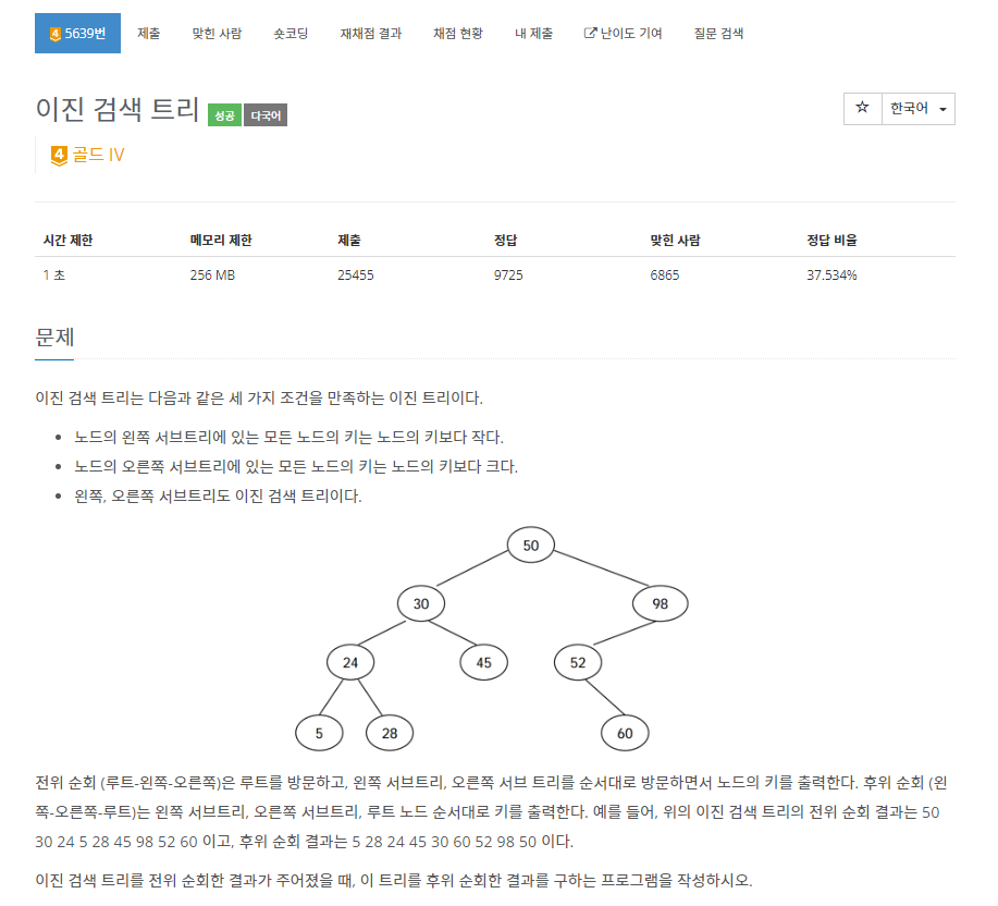 한편, 문제에서 입력받는 수는 전위 순회한 결과이기 때문에 최상단 루트노드를 기준으로 왼쪽에 있는 모든 수가 입력된 다음 오른쪽에 있는 모든 수가 입력된다. 이때 특징은 왼쪽 서브트리의 모든 수들은 루트노드보다 크기가 작다는 것이며, 오른쪽 서브트리의 모든 수들은 루트노드보다 크기가 크다.