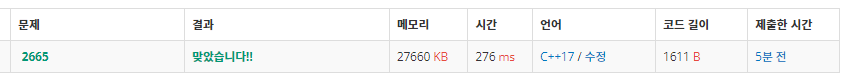 #include <cstdio> #include <queue> #include <algorithm> int N; char room[50 + 2][50 + 2]; int chk[50 + 2][50 + 2]; // 검은방 -> 흰방 바꾼 개수 struct _st { int x; int y; int flag; // 검은방-> 흰방 몇개 바꾸었는지 }; std::queue<_st> Q; void input() { scanf("%d", &N); for (int i = 1; i <= N; i++) { scanf("%s", &room[i][1]); } } void init() { for (int i = 1; i <= N; i++) { for (int j = 1; j <= N; j++) { chk[i][j] = 0x7fffffff; } } } int BFS() { static int dir_x[4] = { 0, 0, 1, -1 }; static int dir_y[4] = { 1, -1, 0, 0 }; // chk배열 초기화 init(); Q.push({ 1, 1, 0 }); // (1, 1) 방을 0개 바꿈 chk[1][1] = 1; while (!Q.empty()) { _st data = Q.front(); Q.pop(); for (int p = 0; p < 4; p++) { int nx = data.x + dir_x[p]; int ny = data.y + dir_y[p]; if (nx < 1 || nx > N || ny < 1 || ny > N) continue; // 영역을 벗어났다면 스루 if (chk[nx][ny] <= data.flag) continue; if (room[nx][ny] == '0') { // 검은방을 만났다면 int nflag = data.flag + 1; if (chk[nx][ny] <= nflag) continue; chk[nx][ny] = nflag; Q.push({ nx, ny, nflag }); } else { chk[nx][ny] = data.flag; Q.push({ nx, ny, data.flag }); } } } return chk[N][N]; } int main() { input(); int ans = BFS(); printf("%d\n", ans); return 0; }비용의 관점에서 BFS를 돌리는 문제이다.
