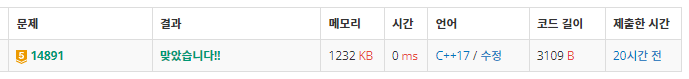[백준 14891] 톱니바퀴C 프로그래밍/BOJ 2022. 10. 3. 14:58728x90 https://www.acmicpc.net/problem/14891 14891번: 톱니바퀴 첫째 줄에 1번 톱니바퀴의 상태, 둘째 줄에 2번 톱니바퀴의 상태, 셋째 줄에 3번 톱니바퀴의 상태, 넷째 줄에 4번 톱니바퀴의 상태가 주어진다. 상태는 8개의 정수로 이루어져 있고, 12시방향부터 www.acmicpc.net #include <cstdio> #include <queue> char in_data[4 + 2][8 + 2]; int topni[4 + 2][8 + 2]; // 숫자로 변경해서 운영 // N극이면 0, S극이면 1 int K; int score[2][4] = { {0, 0, 0, 0}, // 12시 방향이 N극일때 {1, 2, 4, 8} // S극일때 점수판 }; struct _st { int n; // 몇번째 톱니바퀴가 int d; // 어떤 방향으로 회전할 것인지 // -1 반시계, 1 시계 int flag; // 한번 연쇄 일어나면 while문 탈출위해 }; std::queue<_st> Q; void input() { for (int i = 0; i < 4; i++) { scanf("%s", &in_data[i]); for (int j = 0; j < 8; j++) { topni[i][j] = in_data[i][j] - '0'; } } } void clock_wise(int num) { int tmp = topni[num][7]; for (int i = 7; i >= 1; i--) { topni[num][i] = topni[num][i - 1]; } topni[num][0] = tmp; } void non_clock_wise(int num) { int tmp = topni[num][0]; for (int i = 0; i <= 6; i++) { topni[num][i] = topni[num][i + 1]; } topni[num][7] = tmp; //debug(); } void simul(int num, int dir) { Q = {}; // simul함수 여러번 돌릴거라서 초기화 Q.push({ num, dir, 0}); int r = 0; while (!Q.empty()) { _st data = Q.front(); Q.pop(); if (data.flag == 2) return; // 연쇄는 한번 까지만 확인하고 함수 탈출 switch (data.n) // 연쇄 확인 { case 0: r = 0; if (topni[0][2] != topni[1][6]) { r++; Q.push({ 1, -data.d, data.flag + 1 }); } if (r == 1 && topni[1][2] != topni[2][6]) { r++; Q.push({ 2, data.d, data.flag + 1 }); } if (r == 2 && topni[2][2] != topni[3][6]) Q.push({ 3, -data.d, data.flag + 1 }); break; case 1: r = 0; if (topni[1][6] != topni[0][2]) Q.push({ 0, -data.d, data.flag + 1 }); if (topni[1][2] != topni[2][6]) { r++; Q.push({ 2, -data.d, data.flag + 1 }); } if (r == 1 && topni[2][2] != topni[3][6]) Q.push({ 3, data.d, data.flag + 1 }); break; case 2: r = 0; if (topni[2][2] != topni[3][6]) Q.push({ 3, -data.d, data.flag + 1 }); if (topni[2][6] != topni[1][2]) { r++; Q.push({ 1, -data.d, data.flag + 1 }); } if (r == 1 && topni[1][6] != topni[0][2]) Q.push({ 0, data.d, data.flag + 1 }); break; case 3: r = 0; if (topni[3][6] != topni[2][2]) { r++; Q.push({ 2, -data.d, data.flag + 1 }); } if (r == 1 && topni[2][6] != topni[1][2]) { r++; Q.push({ 1, data.d, data.flag + 1 }); } if (r == 2 && topni[1][6] != topni[0][2]) Q.push({ 0, -data.d, data.flag + 1 }); break; } switch (data.d) // 회전 { case 1: clock_wise(data.n); break; case -1: non_clock_wise(data.n); break; } } } void get_rotate() { scanf("%d", &K); for (int i = 0; i < K; i++) { int n = 0, dir = 0; scanf("%d %d", &n, &dir); simul(n - 1, dir); // 0 ~ 3로 인덱싱함 } } int get_score() { int total = 0; for (int i = 0; i < 4; i++) { int dir = topni[i][0]; // i번째 톱니바퀴의 12시방향이 어떤 극인지 total += score[dir][i]; // 0번이면 N극, 1번이면 S극 } return total; } int main() { input(); get_rotate(); int ans = get_score(); printf("%d\n", ans); return 0; }이 문제 솔직히 재밌게 풀었다 ㅋㅋ 잘 풀리지는 않았지만... 오랜 시간이 걸려서 1트에 성공해서 기부니가 매우 좋았던 문제 ㅎ.. 사실 스킬적인 요소보다는 로직을 짤 때 헷갈리지 않는게 중요하다 ... ㅋㅋㅋㅋ 혼동이 될 만한 몇가지 포인트를 제시하자면 다음과 같다. 1. 시계방향으로 회전하는 경우 톱니는 01234567 -> 70123456 순서가 된다. 반 시계방향이면 01234567 -> 12345670 순서가 된다. 2. 연쇄는 한 번만 일어나되, 회전시키기 이전의 상태를 기준으로 한다. 3. 만약 1번 톱니바퀴가 회전하는 경우 4번 톱니바퀴가 회전할 수 있는 경우는 1번 톱니바퀴 회전 -> 2번 톱니바퀴 회전 -> 3번 톱니바퀴 회전이 일어나는 경우이다. 3번 톱니바퀴와 4번톱니바퀴의 맞닿은 극이 다르다고 하더라도, 3번 톱니바퀴가 회전하지 않으면 4번 톱니바퀴는 회전하지 못한다. // simul( ) 함수 2번 주의사항을 구현하기 위해 각 command마다 flag를 달아주었다. 연쇄는 한번만 일어나야 하므로 flag == 2가 되면 while루프를 빠져나오도록 구현했다. 그리고 회전을 시키기 전에 각 톱니바퀴가 맞닿은 극이 같은지 다른지 판별한 후 큐에 삽입해주었다. 이때 3번 주의사항을 반영하기 위해 r 이라는 플래그를 사용하여 회전 여부를 기록해주었다. 728x90'C 프로그래밍 > BOJ' 카테고리의 다른 글[백준 16236] 아기 상어 (0) 2022.10.04 [백준 16235] 나무 재테크 (0) 2022.10.03 [백준 11562] 백양로 브레이크 (0) 2022.10.02 [백준 2665] 미로만들기 (0) 2022.10.01 [백준 17141] 연구소 3 (0) 2022.10.01