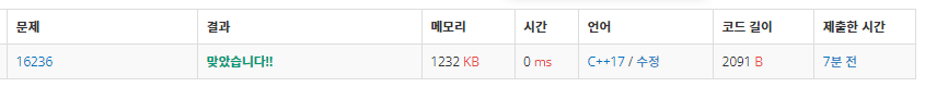#include <cstdio> #include <queue> #include <algorithm> using namespace std; int N; int ocean[20 + 2][20 + 2]; int chk[20 + 2][20 + 2]; // 걸린 시간 담아주기 위해 int sx, sy; // 상어 위치 int sz = 2; // 상어 사이즈 struct _qt { int x; int y; int size; int cnt; }; struct COMP { bool operator()(_qt &a, _qt &b) { if (a.cnt == b.cnt && a.x == b.x) return a.y > b.y; // 그러한 물고기가 여러마리라면 가장 왼쪽에 있는 물고기 if (a.cnt == b.cnt) return a.x > b.x; // 거리가 가까운 물고기가 많다면 가장 위에 있는 물고기 return a.cnt > b.cnt; // 거리가 가장 가까운 물고기를 먹으러 간다. } }; priority_queue<_qt, vector<_qt>, COMP> PQ; void input() { scanf("%d", &N); for (int i = 0; i < N; i++) { for (int j = 0; j < N; j++) { scanf("%d", &ocean[i][j]); if (ocean[i][j] == 9) { sx = i; sy = j; } } } } int BFS() { static int dir_x[4] = { 0, 0, 1, -1 }; static int dir_y[4] = { 1, -1, 0, 0 }; // BFS 여러번 돌리므로 초기화 fill(&chk[0][0], &chk[0][0] + sizeof(chk) / sizeof(int), -1); // 아기상어 자기자신 0초부터 시작하므로 PQ = {}; PQ.push({ sx, sy, sz, 0 }); // 상어 처음위치, 사이즈, 걸린 시간 담아줌 chk[sx][sy] = 0; // 상어 처음 위치에서 걸린 시간 표시 ocean[sx][sy] = 0; // 시작위치 0으로 변경 while (!PQ.empty()) { _qt data = PQ.top(); PQ.pop(); if (ocean[data.x][data.y] != 0 && ocean[data.x][data.y] < data.size) { // 해당 맵에 물고기가 있고, 현재 상어 사이즈보다 작으면 sx = data.x; sy = data.y; return chk[sx][sy]; //PQ를 사용했기 때문에 바로 리턴해줄 수 있음 } for (int p = 0; p < 4; p++) { int nx = data.x + dir_x[p]; int ny = data.y + dir_y[p]; int ncnt = data.cnt + 1; if (nx < 0 || nx > N - 1 || ny < 0 || ny > N - 1) continue; if (ocean[nx][ny] > sz) continue; // 해당 위치의 물고기가 자신보다 큰 경우 스루 if (chk[nx][ny] != -1) continue; // 이미 방문한 위치이면 스루 chk[nx][ny] = chk[data.x][data.y] + 1; // 해당 위치까지 오는데 걸린 시간 저장 PQ.push({ nx, ny, data.size, chk[nx][ny] }); } } return chk[sx][sy]; // PQ에 아무것도 안들어가면 중간에 리턴 안되므로 처음 좌표의 체크 배열 위치 리턴해주어야 한다. } int lets_eat() { int total = 0; int ate = 0; while (1) { int tmp = BFS(); // 지금까지 몇초 걸렸는지 if (tmp == 0) break; total += tmp; ate++; if (ate == sz) { sz++; // 자신의 크기와 같은 수의 물고기를 먹을 때 마다 크기가 1 증가한다. ate = 0; } } return total; } int main() { input(); int ans = lets_eat(); printf("%d\n", ans); return 0; }제 2의 인구이동이랄까.... 점심 즈음 내 멘탈을 박살냈던 문제 ㅋㅅㅋ