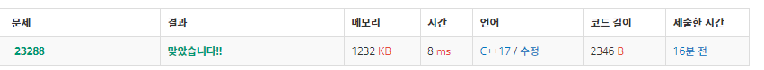 #include <cstdio> #include <cstring> #include <queue> int R, C; int board[20 + 2][20 + 2]; int K; // 1000 까지 int total; struct _st { int x, y; }; std::queue<_st> Q; int visited[20 + 2][20 + 2]; // 0동 1남 2서 3북 int dir_x[4] = { 0, 1, 0, -1 }; int dir_y[4] = { 1, 0, -1, 0 }; int dir_op[4] = { 2, 3, 0, 1 }; int sx, sy; // 초기위치(0, 0) int sdir; // 초기방향 동쪽0 int dice[7] = { 0, 1, 2, 3, 4, 5, 6 }; void input() { scanf("%d %d %d", &R, &C, &K); for (int i = 0; i < R; i++) { for (int j = 0; j < C; j++) { scanf("%d", &board[i][j]); } } } void update_dice(int dir) { int n1 = dice[1], n2 = dice[2], n3 = dice[3], n4 = dice[4], n5 = dice[5], n6 = dice[6]; switch (dir) { case 0: // 동 dice[1] = n4; dice[3] = n1; dice[4] = n6; dice[6] = n3; break; case 1: // 남 dice[1] = n2; dice[2] = n6; dice[5] = n1; dice[6] = n5; break; case 2: // 서 dice[1] = n3; dice[3] = n6; dice[4] = n1; dice[6] = n4; break; case 3: // 북 dice[1] = n5; dice[2] = n1; dice[5] = n6; dice[6] = n2; break; } } void move() { int nx = sx + dir_x[sdir]; int ny = sy + dir_y[sdir]; if (nx < 0 || nx > R - 1 || ny < 0 || ny > C - 1) { int ndir = dir_op[sdir]; nx = sx + dir_x[ndir]; ny = sy + dir_y[ndir]; sdir = ndir; } sx = nx, sy = ny; update_dice(sdir); //printf("%d %d %d\n", sx, sy, sdir); } int get_score() { Q = {}; memset(visited, 0, sizeof(visited)); Q.push({ sx, sy }); // 현위치 visited[sx][sy] = 1; int type = board[sx][sy]; int cann = 1; // 자신이 현재 지금 있는 칸 포함 while (!Q.empty()) { _st data = Q.front(); Q.pop(); for (int p = 0; p < 4; p++) { int nx = data.x + dir_x[p]; int ny = data.y + dir_y[p]; if (nx < 0 || nx > R - 1 || ny < 0 || ny > C - 1) continue; if (visited[nx][ny]) continue; if (board[nx][ny] != type) continue; Q.push({ nx, ny }); visited[nx][ny] = 1; cann++; } } return cann * type; } void get_dir() { int A = dice[6]; int B = board[sx][sy]; if (A > B) sdir = (sdir + 1) % 4; if (A < B) sdir = (sdir + 3) % 4; if (A == B) sdir = sdir; //printf("A: %d B: %d dir:%d\n", A, B, sdir); } void simul() { for (int k = 0; k < K; k++) { move(); total += get_score(); get_dir(); } } int main() { input(); simul(); printf("%d\n", total); return 0; }728x90'C 프로그래밍 > BOJ' 카테고리의 다른 글