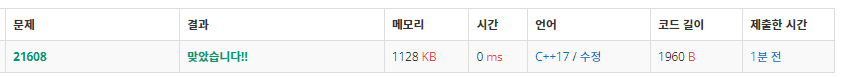 맞왜틀 아님... 생각 좀 해라 #include <cstdio> int N, M; // N * N, 학생수 int board[20 + 5][20 + 5]; struct _st { int stnum; int x = 0x7fffffff; int y = 0x7fffffff; }; _st student[400 + 5]; int prefer, blank; // 각 탐색에서 쓸 변수 int lookup[400 + 5][4 + 5]; // 선호하는 친구 룩업테이블 int score[5] = { 0, 1, 10, 100, 1000 }; // 점수판 int dir_x[4] = { 0, 0, 1, -1 }; int dir_y[4] = { 1, -1, 0, 0 }; void input() { scanf("%d", &N); M = N * N; // 학생수 for (int i = 1; i <= M; i++) { int s = 0; scanf("%d", &s); student[i].stnum = s; for (int j = 0; j < 4; j++) { scanf("%d", &lookup[s][j]); } } } void chk(int stnum, int x, int y) { for (int p = 0; p < 4; p++) { int nx = x + dir_x[p]; int ny = y + dir_y[p]; if (nx < 1 || nx > N || ny < 1 || ny > N) continue; if (board[nx][ny] == 0) blank++; // 빈칸 확인 for (int k = 0; k < 4; k++) { if (board[nx][ny] != 0 && board[nx][ny] == lookup[stnum][k]) prefer++; // 좋아하는 학생 확인 } } //printf("pf : %d bk : %d\n", prefer, blank); } void simul() { for (int s = 1; s <= M; s++) { int max_prefer = 0; int max_blank = 0; for (int i = 1; i <= N; i++) { for (int j = 1; j <= N; j++) { if (board[i][j]) continue; // 해당 자리에 이미 누가 앉았다면 다음 자리를 탐색 prefer = 0; // 초기화 blank = 0; chk(student[s].stnum, i, j); if (max_prefer < prefer) { max_prefer = prefer; max_blank = blank; // blank도 같이 갱신 필요하다. student[s].x = i; student[s].y = j; } if (max_prefer == prefer) { if (max_blank < blank) { max_blank = blank; student[s].x = i; student[s].y = j; } } if (max_prefer == prefer && max_blank == blank) { if (i < student[s].x) { student[s].x = i; student[s].y = j; } } if (max_prefer == prefer && max_blank == blank && i == student[s].x) { if (j < student[s].y) { student[s].x = i; student[s].y = j; } } //printf("[%d] %d %d\n", student[s].stnum, student[s].x, student[s].y); } } board[student[s].x][student[s].y] = student[s].stnum; } //debug(); } int output() { int total = 0; for (int i = 1; i <= N; i++) { for (int j = 1; j <= N; j++) { int cnt = 0; for (int p = 0; p < 4; p++) { int ni = i + dir_x[p]; int nj = j + dir_y[p]; if (ni < 1 || ni > N || nj < 1 || nj > N) continue; for (int k = 0; k < 4; k++) { if (board[ni][nj] == lookup[board[i][j]][k]) cnt++; } } total += score[cnt]; } } return total; } int main() { input(); simul(); int ans = output(); printf("%d\n", ans); return 0; }나는 가장 생각하기 쉬운 방법으로 코드를 짰다.