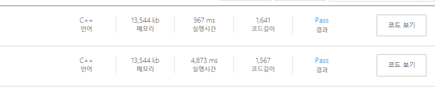 #include <cstdio> #include <cstring> #include <algorithm> int T; int R, C, K; int board[13 + 2][20 + 2]; int ans = 0x7fffffff; void input() { //init memset(board, 0, sizeof(board)); ans = 0x7fffffff; scanf("%d %d %d", &R, &C, &K); for (int r = 0; r < R; r++) { for (int c = 0; c < C; c++) { scanf("%d", &board[r][c]); } } } bool chk_pass() { for (int c = 0; c < C; c++) { int curr_type = board[0][c]; int curr_cnt = 1; int pass = false; for (int r = 1; r < R; r++) { if (curr_type == board[r][c]) { curr_cnt++; if (curr_cnt >= K) { pass = true; break; } } else { curr_type = board[r][c]; curr_cnt = 1; } } if (pass == false) return false; } return true; } void DFS(int row, int cnt) { //가지치기 조건 // 이거 없으면 실행시간 5배 차이남 if (ans < cnt) return; if (K == 1) { // 엣지케이스 생각 ans = cnt; return; } if (chk_pass()) { if (ans > cnt) ans = cnt; return; } if (row > R - 1) return; // backup int tmp[20 + 2]; memcpy(tmp, board[row], sizeof(tmp)); // 아무것도 투입하지 않음 DFS(row + 1, cnt); // 약품 A 투입 std::fill(board[row], board[row] + C, 0); DFS(row + 1, cnt + 1); memcpy(board[row], tmp, sizeof(tmp)); // 약품 B 투입 std::fill(board[row], board[row] + C, 1); DFS(row + 1, cnt + 1); memcpy(board[row], tmp, sizeof(tmp)); } int main() { scanf("%d", &T); for (int t = 1; t <= T; t++) { input(); DFS(0, 0); printf("#%d %d\n", t, ans); } return 0; }엣지케이스 주의하자...