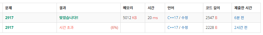 #include <cstdio> #include <vector> #include <queue> #include <cstring> int R, C; // 행,열 char board[500 + 2][500 + 2]; int Dist[500 + 2][500 + 2]; int hx, hy; // 현우좌표 int ox, oy; // 오두막 좌표 struct _st { int x, y; int dist; }; std::vector<_st> V; std::queue<_st> Q; int visited[500 + 2][500 + 2]; struct COMP { bool operator()(const _st &a, const _st &b) { return a.dist < b.dist; } }; std::priority_queue<_st, std::vector<_st>, COMP> PQ; void input() { scanf("%d %d", &R, &C); for (int i = 0; i < R; i++) { scanf("%s", &board[i]); for (int j = 0; j < C; j++) { if (board[i][j] == '+') V.push_back({ i, j, 0 }); else if (board[i][j] == 'V') { hx = i; hy = j; board[i][j] = '.'; } else if (board[i][j] == 'J') { ox = i; oy = j; board[i][j] = '.'; } } } } // 다익스트라 써도 되지만 안써도 된다. // 어차피 먼저 더 가까운 나무가 있었다면 먼저 도착해서 Dist 채워졌을 것임 void get_dist() // 각 칸들과 나무 사이의 최단경로 구하기 { // init memset(Dist, -1, sizeof(Dist)); // dir int dir_x[4] = { 0, 0 ,1 ,-1 }; int dir_y[4] = { 1, -1, 0, 0 }; for (_st v : V) { Q.push({ v.x, v.y, 0 }); Dist[v.x][v.y] = 0; } while (!Q.empty()) { _st data = Q.front(); Q.pop(); for (int p = 0; p < 4; p++) { int nx = data.x + dir_x[p]; int ny = data.y + dir_y[p]; if (nx < 0 || nx > R - 1 || ny < 0 || ny > C - 1) continue; if (Dist[nx][ny] >= 0) continue; Q.push({ nx, ny, data.dist + 1 }); Dist[nx][ny] = Dist[data.x][data.y] + 1; } } } int BFS() // V -> J로 향하는데 각 칸마다 cost가 다르므로 우선순위 큐 { // init PQ = {}; memset(visited, 0, sizeof(visited)); // dir int dir_x[4] = { 0, 0 ,1 ,-1 }; int dir_y[4] = { 1, -1, 0, 0 }; PQ.push({ hx, hy, Dist[hx][hy] }); visited[hx][hy] = 1; int ans = Dist[hx][hy]; while (!PQ.empty()) { _st data = PQ.top(); PQ.pop(); if (ans > data.dist) ans = data.dist; if (data.x == ox && data.y == oy) return ans; for (int p = 0; p < 4; p++) { int nx = data.x + dir_x[p]; int ny = data.y + dir_y[p]; if (nx < 0 || nx > R - 1 || ny < 0 || ny > C - 1) continue; if (visited[nx][ny]) continue; PQ.push({ nx, ny, Dist[nx][ny] }); visited[nx][ny] = 1; } } return -1; } int main() { input(); get_dist(); printf("%d\n", BFS()); return 0; }이동 중 모든 칸에서 나무까지의 최단경로 다 구한 사람 naya na.. naya na....