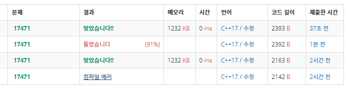 선거구는 2개 이므로 위와 같은 과정을 두 번 진행해주고, 만약 cityi == Ci.size() (즉, C1[0] 과 연결되어 있는 구역의 개수가 현재 Ci 선거구에 포함된 구역의 수와 같다면) 조건을 만족하는 것이므로 true를 리턴해준다.728x90'C 프로그래밍 > BOJ' 카테고리의 다른 글