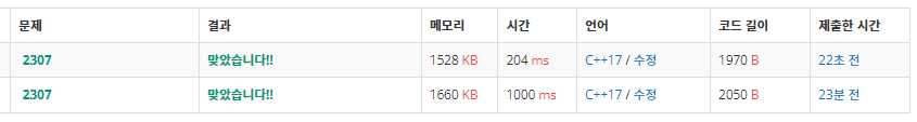 이러한 처리 후 choose_edge에서 간선을 선택해줄 때는, 용의자가 지나가지 않는 간선을 검문하더라도 시간의 변화에는 아무 영향이 없으므로 continue한다. 용의자가 지나가는 간선에 대해서만 BFS 함수를 실행하여 N까지 도달하는데 걸리는 시간을 계산해주면 된다.