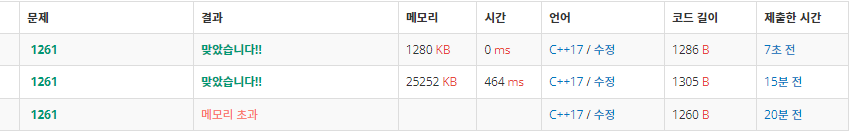 방문배열 visited[100 +2][100 +2][10000] 가 만들어 지지 않아서, 벽을 1개 부수었을 때 ~ 최대 9998개 부수었을 때 방문할 수 있는 좌표를 S라는 set에 저장해주었다.